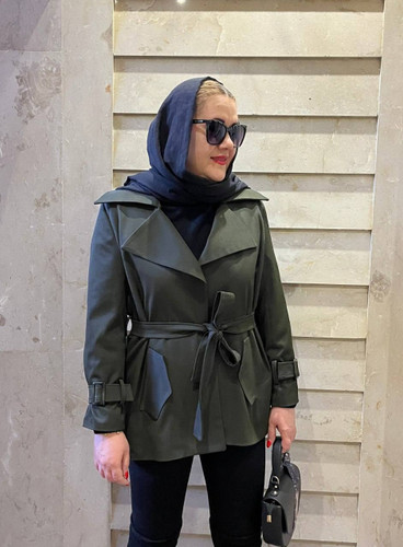 بارانی زنانه کوتاه سبز یشمی جنس کتان