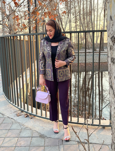 کت و شلوار زنانه بنفش ژاکارد یقه انگلیسی