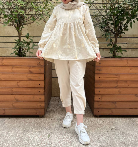 تونیک زنانه کرم یقه گرد جلو بسته