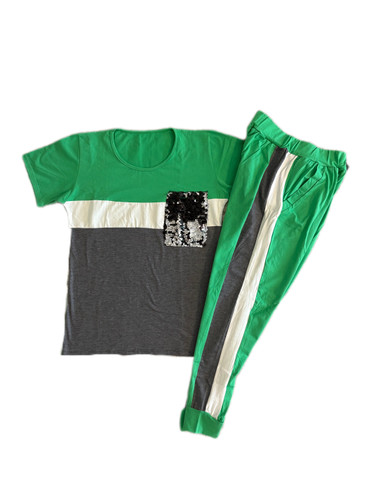 تیشرت شلوار سبز جیب پولکی زنانه